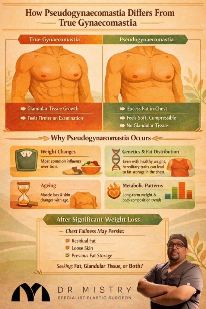 Pseudogynaecomastia usually develops due to several contributing factors that interact over time. Weight changes are the most common influence. However, men with stable or healthy weight ranges may still experience chest fullness if they are genetically predisposed to storing fat in this region.